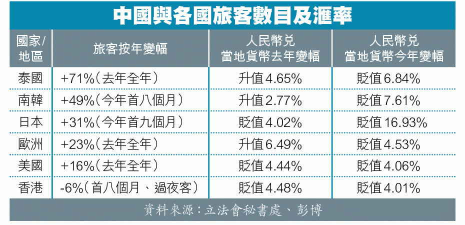 內地客減少來港,新鮮感是其一、滙水是其二。今年人幣兌日圓跌了17%,年內首九個月赴日內地客仍增三成,反映日圓升番,內地客同港人一樣,有戀日情意結,去完東京,可能去再去大阪北海道,反之香港去過一次,翻兜已冇興致。
