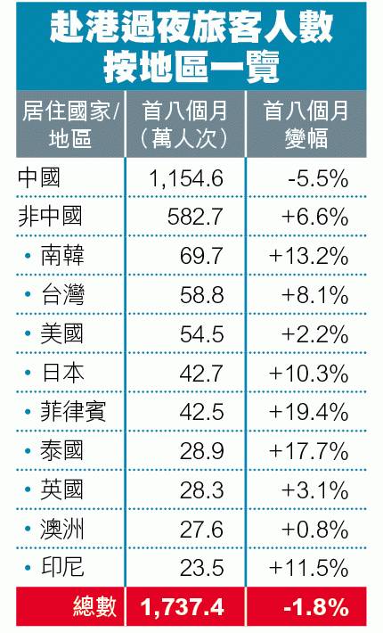 根據立法會秘書處資訊服務部最新報告,上半年不過夜旅客人均消費按年跌10.5%,與旅客人次跌幅相若。不過,過夜客人均消費竟劇跌14.6%,其中購物消費跌了23%,皆遠超旅客人次低單位數跌幅。今年首八個月,過夜旅客人數實際只跌1.8%,當中內地客佔整體三分二,人數按年跌5.5%,但非內地客實際升了6.6%,部份國家如南韓、日本等,旅客升幅更超過一成。