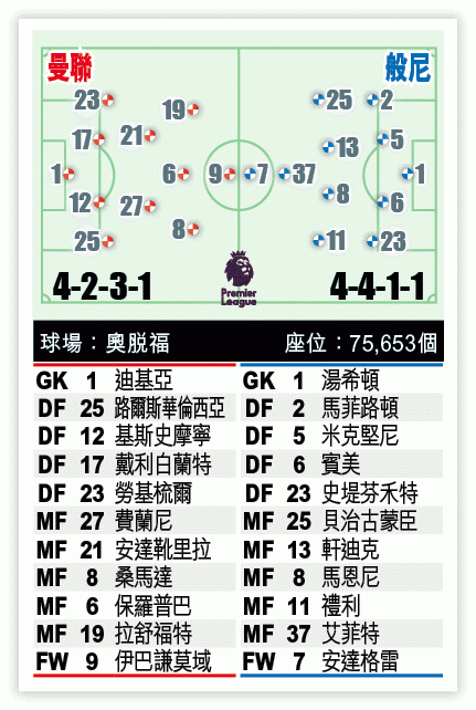 防線方面,中堅艾歷拜利因傷要休戰兩個月;摩帥在英聯盃派上馬高斯盧祖夥拍戴利白蘭特扼守中路,預計今仗會改由基斯史摩寧代替前者。儘管史摩寧在慘負車路士一仗頻頻犯錯,但今仗面對火力疲弱的般尼,相信夠班頂得住。
