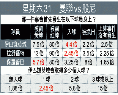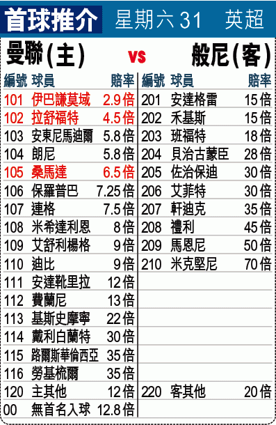 曼聯近七場英超僅一仗能攻入對手超過一球,今迎般尼要大炒對手有難度,不妨追捧[2.5球]「細」。「讓球主客和」開曼聯[-2]亦未免太辣,般尼「客勝」同樣值博。文:何西