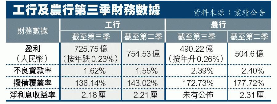 首九個月合計,工行盈利升0.46%至2,227.92億元。另一大行農行(1288),第三季盈利則微升0.26%至490.22億元,若計算首九個月,該行盈利按年升0.63%至1,541.7億元。
