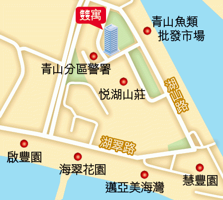 䨇寓位處於碼頭區北面,毗鄰大型居屋悅湖山莊,其餘以政府、機構或社區設施及休憩用地為主,當中包括青山分區警署、變電站、電力站、湖山網球場、湖山草地滾球場以及遊樂場等。另外,亦鄰近海邊的屯門第44區聯用綜合大樓,包括魚類批發市場、社區會堂、龍舟賽事觀看台、垃圾收集站、公廁、海上垃圾收集站,以及海岸公園管理辦事處。