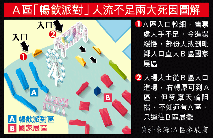 昨美酒佳餚巡禮入夜後人頭湧湧,大部份展區都甚為旺場。不過,位於A區「暢飲派對」的參展商卻怨聲載道,因今年大會從中環入口設兩個售票處,入場人士要到右方售票處才途經A區,否則入場後需繞過摩天輪才可到達。專賣派對酒的永純酒窖負責人陳愷純投訴稱,當初大會聲稱入場人士必經A區,但前晚卻非如此,眼白白看着中央區域人流極多卻無法受惠。第7年參加美酒佳餚巡禮的嘉裕洋行銷售經理梁家威亦指,原見去年銷量不俗,今年特別增至3個攤位,但因被安排在A區,令生意額大減近一半。