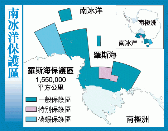 南極海洋生物資源養護委員會(CCAMLR)今周在澳洲塔斯曼尼亞首府荷伯特(Hobart)召開年會,昨日終就在羅斯海設立155萬平方公里保護區達成共識。保護區相當於英、法、德三國總面積,其中72%、即112萬平方公里範圍列為禁止商業捕魚區,但仍容許少數以科學研究為目的的捕魚活動。