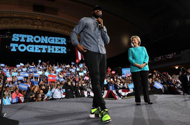 另外,美國總統大選支持的民主黨候選人希拉莉(圖)雖獲得NBA多位星支持,占士早前跟JR史密夫(J.R. Smith)在俄亥俄州為她站台拉票,就連勇士球星史堤芬居里(Stephen Curry)、美國女足門將蘇露、網壇「女金剛」娜華蒂露娃、MLB洋基隊名宿亞歷斯洛迪古斯等人亦曾公開表示支持希拉莉,但這班體壇巨星亦無法助希拉莉勝出;而76人的艾比迪(Joel Embiid)得悉希拉莉落選後,更在社交網站指出美國已經淪亡。至於成功當選為新任美國總統的特朗普,則獲得公牛名宿洛文(Dennis Rodman)、拳王泰臣等人支持。
