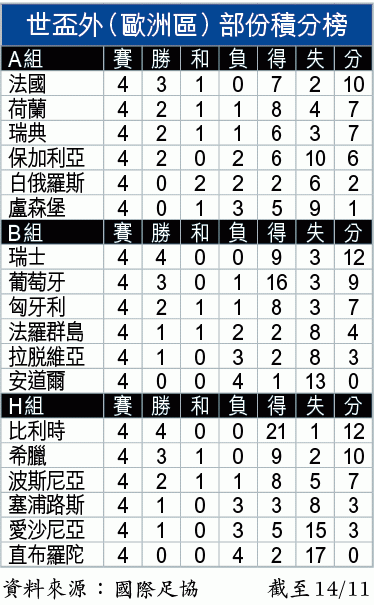 希臘主場對波斯尼亞嘅H組之戰,火藥味就認真大,全場出現12黃兩紅。上半場波軍由祖雲達斯中場比真歷主射罰球,雖然中柱彈出,但就反彈主隊門將卡里捷斯入網,客軍領先1:0。希臘失守後越踢越躁,波軍前鋒迪斯高就梗係成為希臘後衞圍攻嘅目標。