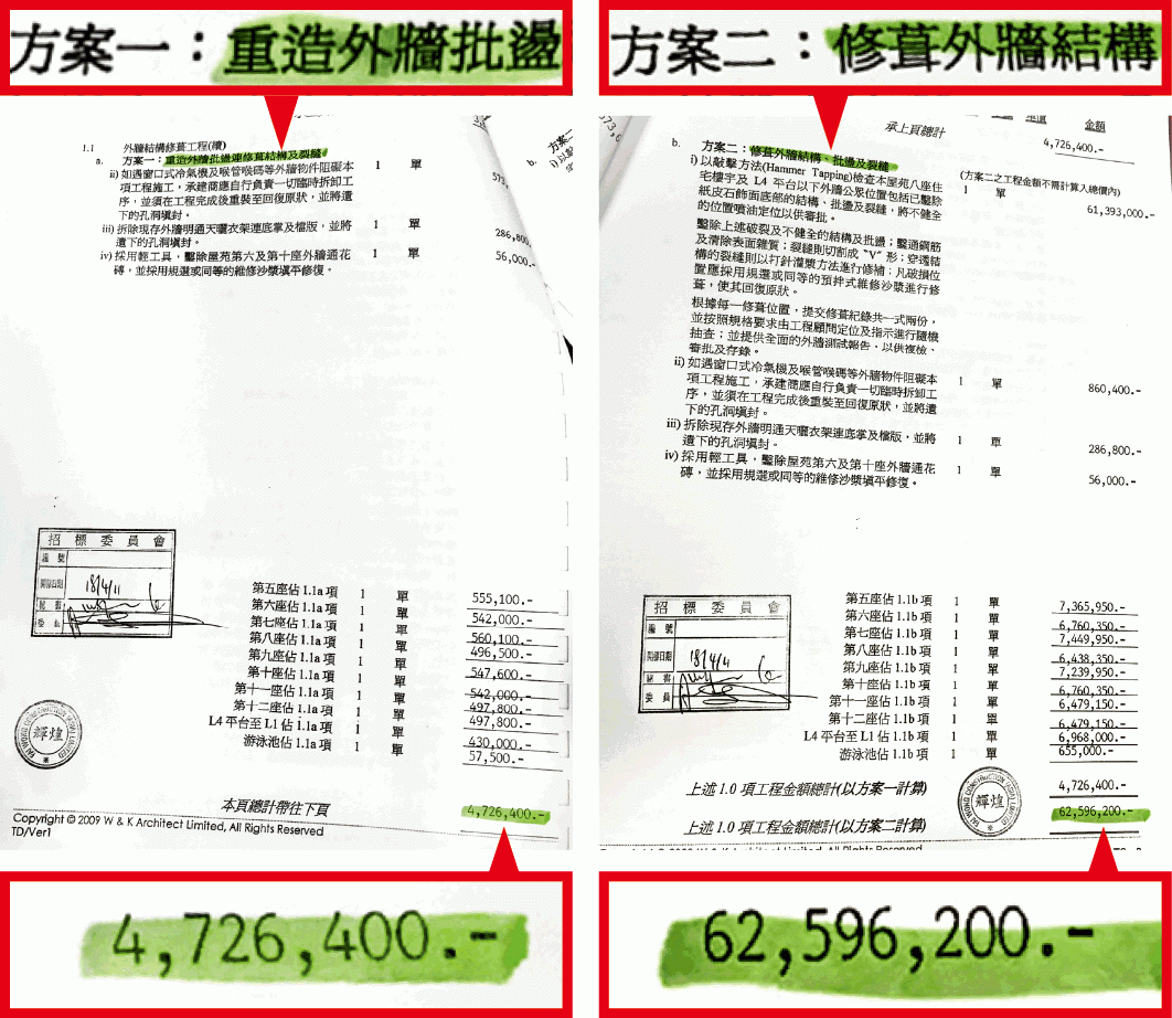 不過,近月翻查工程標書及最終的工程合約,赫然發現標書文件與最終的工程合約金額相差約5,000萬元,由標書顯示約1.2億元,激增至約1.7億元,令每戶最終多付約3萬元。法團主席賴志偉表示,2012年工程招標時,有8間公司投標。其中「輝煌」標書顯示,外牆維修有兩個方案,包括重造外牆及修葺外牆,前者需約473萬元,後者則要約6,200萬元,至於其他標書重造則較修葺外牆昂貴。最終在業主大會上,輝煌中標,業主也揀了重造外牆方案。賴志偉稱,據業主一直理解,總工程造價約為1.2億元。