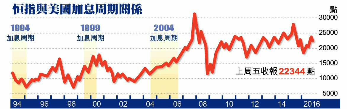 美國聯儲局主席耶倫在特朗普當選後首次表態,於上周四表示,短期內加息可能是適當的,意味在12月議息時,極可能再啟動加息周期。上世紀九十年代以來,美國曾有三次加息周期,港股期間一跌兩升,但多位受訪專家指,今次加息周期與以往不同,在人民幣貶值和本港地產泡沫雙重打擊下,港股難有運行。