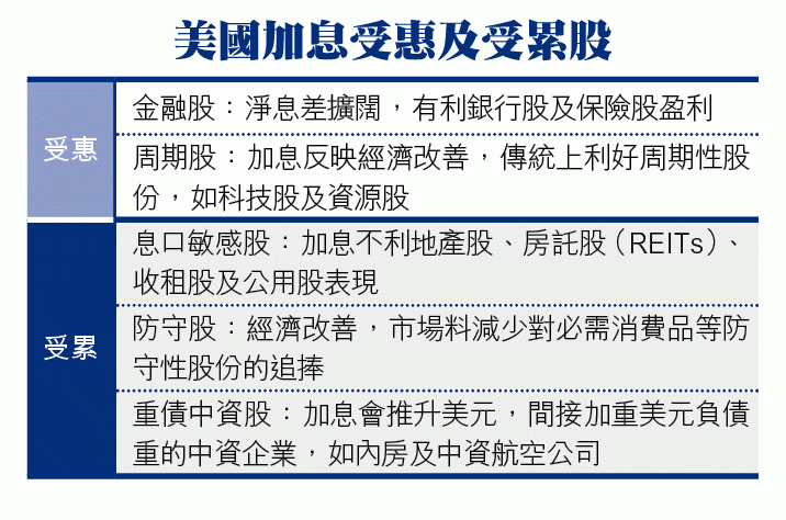 美國加息,理論上利好本港銀行股,因本港息口會跟隨美國調整,不過香港股票分析師協會理事連敬涵提醒,港息未必跟隨美息上升,除非美國明年上半年合共加息兩、三次,逼使本港跟隨聯儲局快速加息,否則本地銀行股未必受惠。