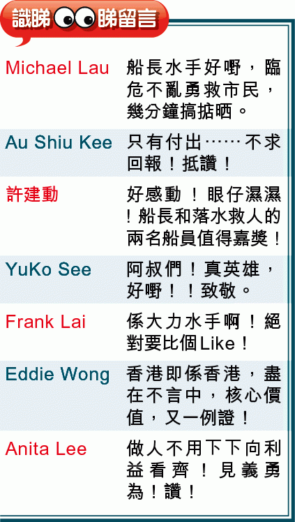 事件曝光後,引起網民激讚,大讚:「阿叔們!真英雄,好嘢!」而徐先生親身目擊整個救人過程,感動至深,大讚船長及水手英勇,並安撫乘客情緒及維持秩序,配合得很完美。兩名水手年紀已不輕,其中一人更見滿頭白髮,仍毫不猶豫跳海救人,徐稱讚「好有勇氣」。