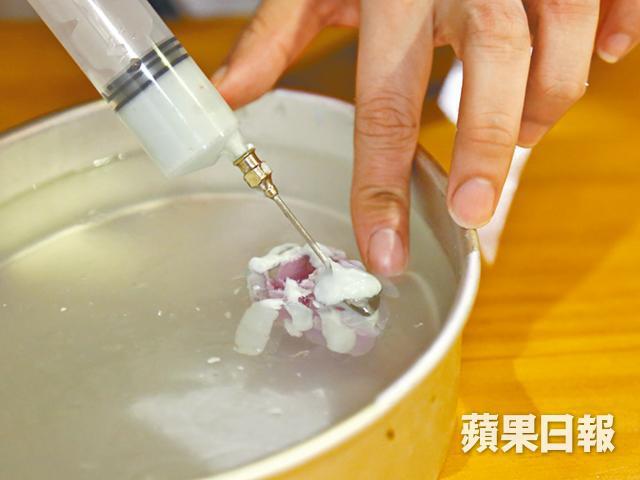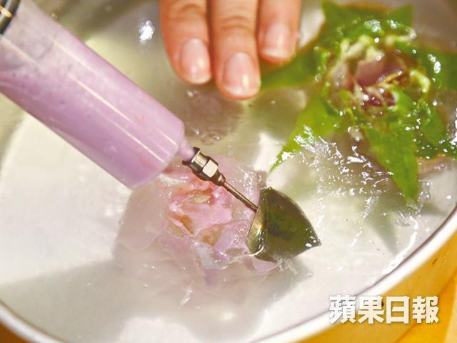 這些像鑲在透明水晶膠的花在東南亞國家如馬來西亞,越南和印尼也很流行。看起來有點像魔術般神奇的啫喱花,原來是利用配上特製金屬花嘴的針筒,在透明啫喱中注入顏色大菜液來製造,當大菜液凝固,反轉看起來便成一朵朵花。原理看起來很簡單,但做起來頗花心機,這次示範的Irene表示擠一盤啫喱花至少要花兩小時,因為要控制大菜液的溫度,落位也要準,就要靠多練習。啫喱花的透明啫喱底可事先準備,能保存一星期。但因為大菜花材料中有椰汁,擠好花後便要放雪櫃, 三日內吃完。
