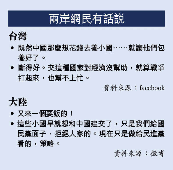 台陸委會昨譴責大陸在國際間利用金錢外交操作其所謂「一個中國原則」,利用金錢外交誘迫聖多美與台斷交。台總統府表示,蔡英文上午召集國安高層會議,針對聖多美與台斷交作裁示,指協助友邦發展是一貫立場,外交不是零和遊戲,限縮、干涉台灣國際參與,對兩岸關係毫無助益,又指示財經部關注股匯市情況。