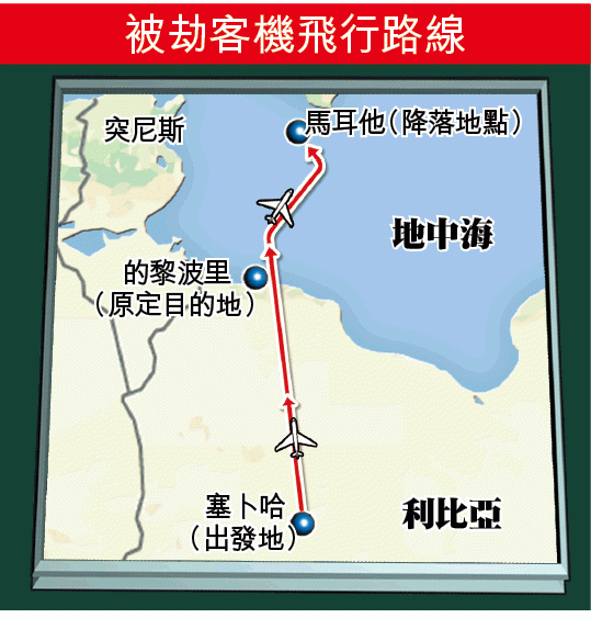 馬耳他電視台報道,兩名劫機者是利比亞已故領袖卡達菲的支持者,揚言只要當局滿足他們尋求庇護的要求,可以先釋放機上乘客,只扣留7名機組人員。