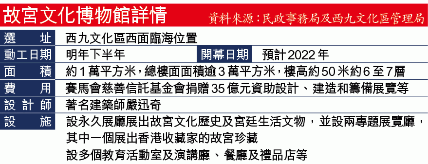 博物館選址在西九文化區西面臨海位置,佔地約1萬平方米,獲賽馬會慈善信託基金會斥資35億元興建,常設故宮文物展覽及專題展區等。西九文化區管理局會設立全資附屬公司營運,並委任著名建築師嚴迅奇設計,正招標工程,明年下半年動工,料2022年開幕。