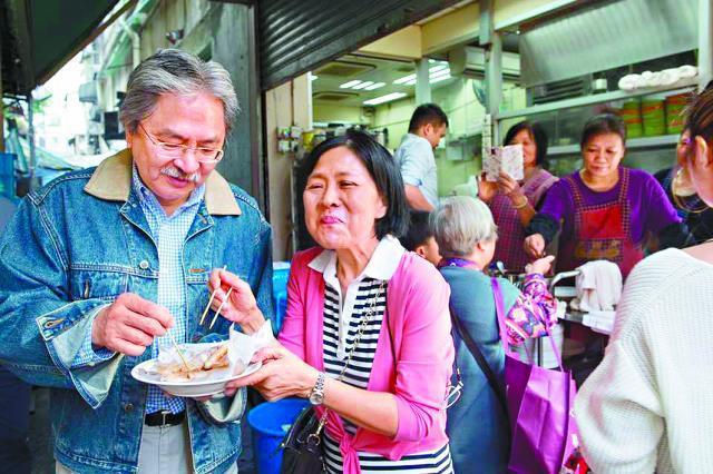【本報訊】考慮參選特首的財政司司長曾俊華辭職,上周一辭職至今13日仍未獲中央批准,但似乎未因此影響心情,休假中的曾俊華頻頻落區保持人氣,一向走本土路線的他昨被「捕獲」與太太及政治助理在深水埗後巷食腸粉。