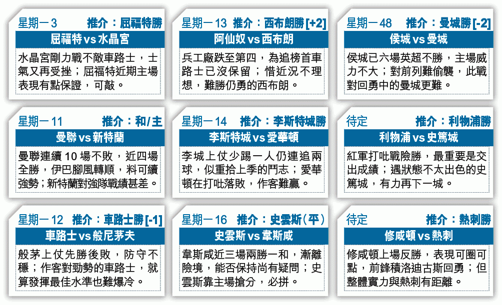 英超榜首的車路士越戰越勇,連勝11場,如在快車檔期延續這股強勢,其他隊難追近他們。阿仙奴是幾支前列隊中,近績較差的一隊,之前連續14場聯賽不敗,守在次席後曾有廠迷談到球隊能否重奪冠軍時,他們大多採取觀望態度,亦懷疑球隊是否有足夠實力重奪冠軍。此外,阿仙奴上半季的賽期是比較多於主場對同級球隊,這明顯有利爭勝;翻查上半季賽程,阿仙奴只有作客曼聯,其餘遇強隊都是主場,到上場作客對曼城便即輸,這多少說明賽期對兵工廠上半季的戰績有助,真正考驗則可能來自下半季。