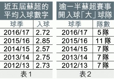 這個時候當然要看看蘇超的數據,三循環加上季後賽組,跟澳職有點相似。先從入球「大」入手吧!近五屆蘇超的平均入球數字都非常穩定(見附表1),但不代表所有球隊都有力取得不少入球。就近五季開出入球「大」場數作比較,只有15/16球季是有11隊(見附表2),其餘四季是五或七隊,所以大家不要因平均入球多於[2.5球],而在蘇超盲目投注入球「大」。