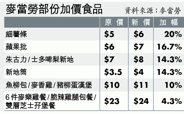 麥當勞對上一次加價為今年1月,超值套餐、超值早晨套餐及醒晨早餐等3款套餐加價,平均加幅2.3%。今次則有13款產品加價,包括魚柳包、麥香雞、豬柳蛋漢堡、蘋果批、朱古力新地、士多啤梨新地及細薯條等6款超值選加價1元,當中細薯條加幅最高達兩成,由5元加至6元。
