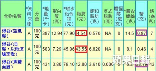 坊間常見的爆谷有焦糖味、牛油味,味道雖好,但營養價值就比原味遜色,Krista說:「每100克原味爆谷有14.5克纖維,而每100克焦糖味爆谷有5.2克纖維,至於每100克牛油味爆谷則有9.9克纖維。」另外,根據食物安全中心的營養資料表,焦糖爆谷的糖份比原味爆谷多約53倍,而牛油味的爆谷脂肪就比原味多出約9.5倍。