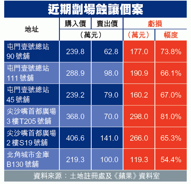 在2014年底拆售的屯門青山坊2號華樂大廈1樓壹號總站,當年呎價最高達2.93萬元,貴絕新界劏場,但商場開幕後淪為死場,業主全數蝕讓。最新成交的90號舖位,建築面積88方呎,實用率只有一半,剛以62.8萬元易手,呎價7,136元。根據土地註冊處資料顯示,原業主於2014年底以239.8萬元購入,呎價高達2.725萬元,事隔兩年賬面大幅蝕讓177萬元,舖價貶值73.8%。