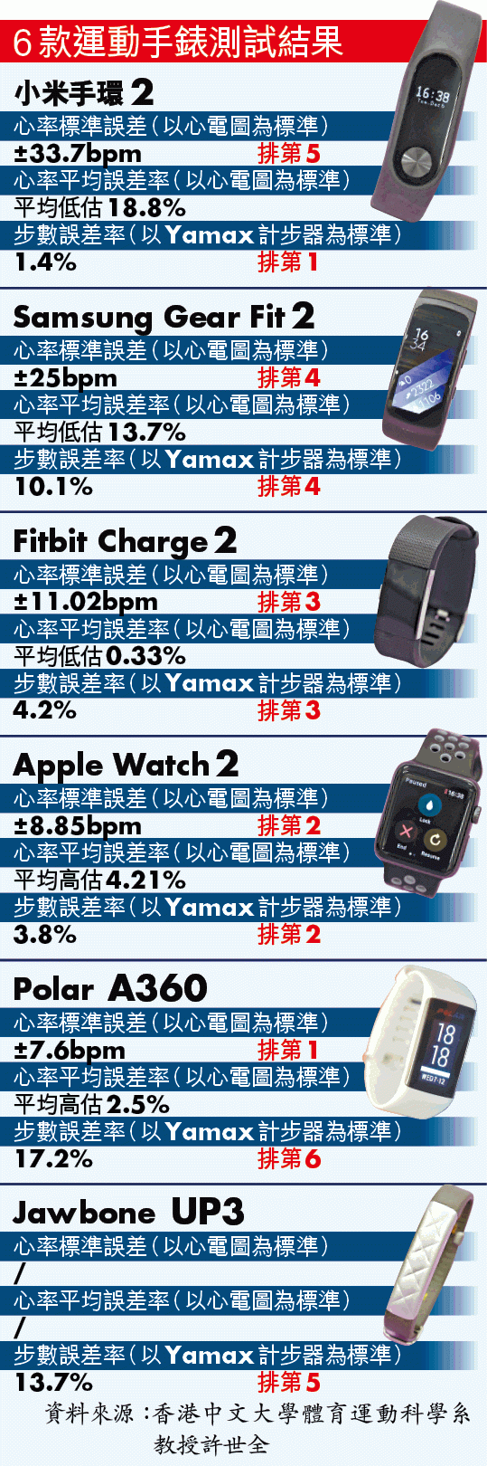 測試由中文大學體育運動科學系教授許世全進行,測試包括Apple Watch 2、Samsung Gear Fit 2、Fitbit Charge 2、Polar A360、小米手環2及Jawbone UP3在心率及步數方面的準確度,並以心電圖及現時公認最準確的Yamax計步器作比較。參與測試的健身教練Felix Ip在配戴手錶後,分別量度由靜止至輕量、中等及劇烈運動的心跳率,運動模式有跑步機及固定單車功率機。