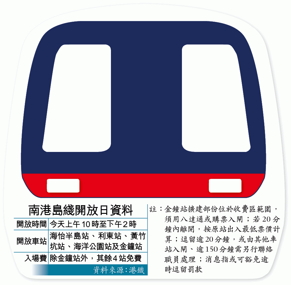 港鐵今早10時至下午2時開放南港島綫海洋公園、黃竹坑、利東、海怡半島4個車站予公眾免費參觀,金鐘站開放點置於收費區故需付費入閘。