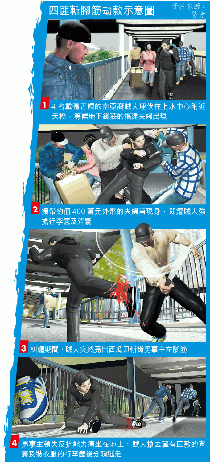【本報訊】一對福建夫婦懷疑擔任地下錢莊「金融螞蟻」,昨日早上從落馬洲攜帶約值400萬元外幣來港,沿着港鐵上水站對開天橋行往上水中心之際,遭一早埋伏的4名南亞裔刀賊截劫,兩人奮力掙扎,刀賊狠施「斬馬刀」毒招斜劈而下,將男事主的左腳筋斬斷,令他頓時失去反抗能力,最終賊人得手後逃去,整個過程僅10秒。事主其後送院治理,警方現正追緝4名賊匪下落。