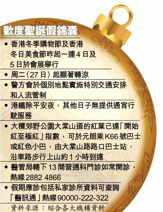 【本報訊】打工仔一連三日聖誕紅假展開,又是盡情吃喝玩樂的日子。天文台預計今日短暫時間有陽光,初時有一陣微雨,氣溫介乎18至21℃。市民早上外出宜帶備雨傘。預料周二(27日)開始天氣明顯轉涼。有醫生提醒市民在流感高𥧌期間,到人多地方要注意預防措施。