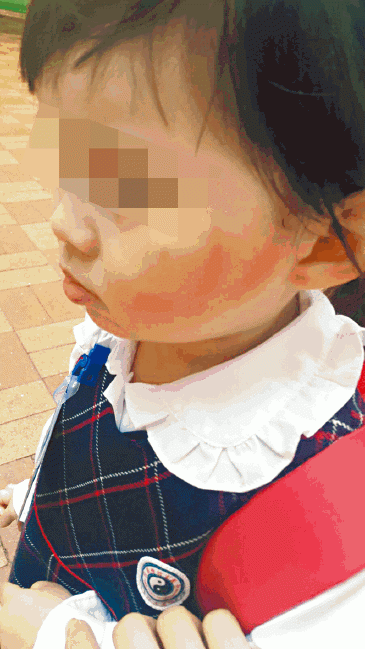 【本報訊】一名就讀藍田圓玄幼稚園(平田邨)的3歲女童上周在校內接連受傷。女童父親葉先生憶述,女兒3天內左右面頰接連受傷,首次校方稱女童因排隊跟同學爭執,被同學打傷導致左面紅腫。事隔一天,女兒再在校內受傷,校方稱女童被聖誕樹所傷,惟校方堅稱無教師清楚事發經過,要求家長「有乜投訴可寫信畀保險公司」。葉先生怒轟校方卸責,疑涉人為疏忽及包庇。
