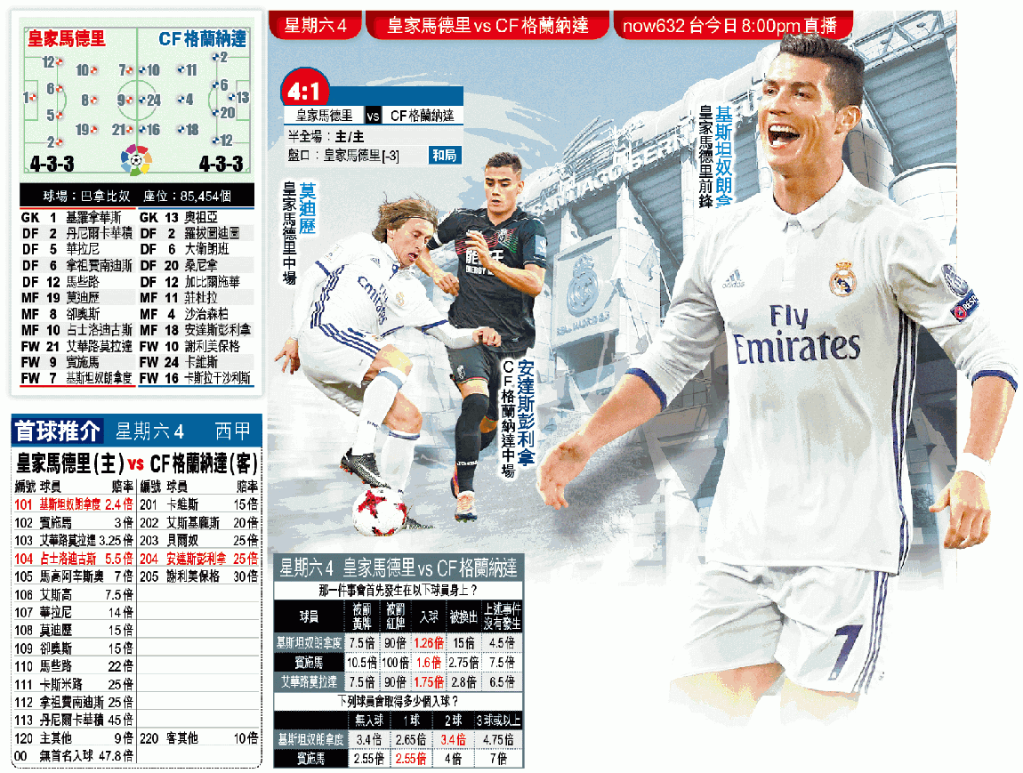 既然皇馬及格蘭納達同樣入得又失得,相信兩軍今場會為球迷獻上一場入球盛宴,所以一於捧[4.5球]「大」。文:咖喱