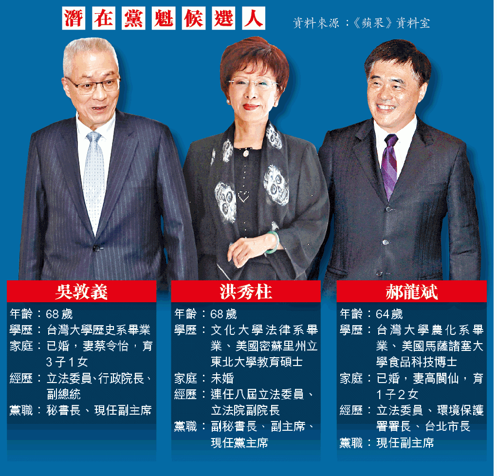 國民黨即將進入「超級星期一」。面臨黨產清算、黨內鬥爭未停的國民黨,隨着黨主席改選將在5月登場,這場隨時影響下屆總統選舉的黨魁爭奪戰已全面展開。除現任黨主席洪秀柱表態競選連任之外,該黨副主席郝龍斌、前副總統吳敦義,也將在下周一正式表態參選,意味國民黨正式宣告進入洪、吳、郝三強鼎立的戰國時代。