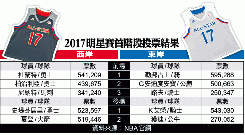 據NBA周四公佈的首階段投票結果,西岸後場正選競爭激烈,勇士的史堤芬居里(Stephen Curry)暫以523,597票居首,夏登以519,446票緊隨其後,韋少則落後夏登17,794票。不過,最令人驚訝是勇士的柏治利亞(Zaza Pachulia)暫列西岸前場第二,這位32歲中鋒上季已獲只得約400萬人口的格魯吉亞舉國支持,亦有傳他獲勇士球迷保送,務求令球隊破紀錄五名正選同時入圍。NBA將於本月12日公佈次階段投票結果,投票將於16日截止,而正選名單會在19日宣佈。
