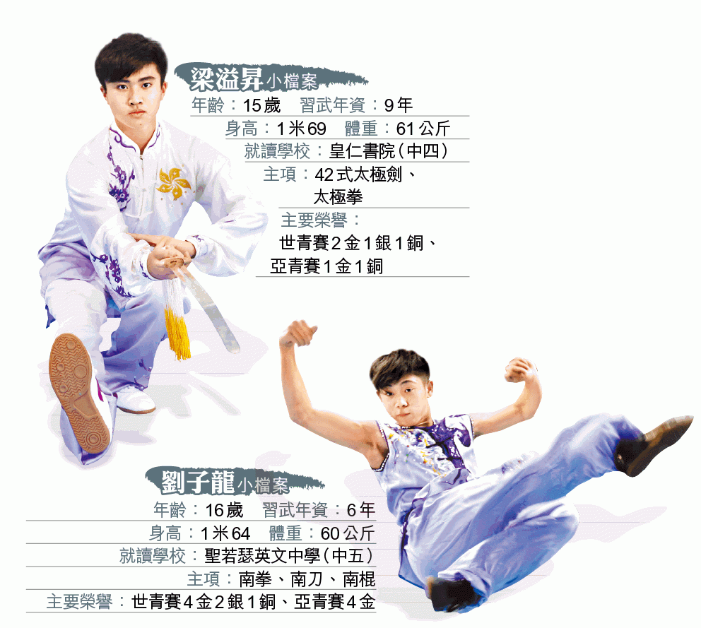 穿上色彩繽紛的武術服裝,15歲的梁溢昇幻想《花木蘭》將軍英姿颯颯,16歲的劉子龍幻想變身超人迪加;一個是智商131的資優名校生,一個是全職港隊代表,兩位應屆世青武術冠軍期望今年有更大突破。