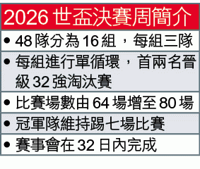 【綜合瑞士及中國外電】國際足協昨日宣佈,自2026年世盃起,決賽周參賽隊伍會增加至48隊,分組賽會改為三隊一組,首兩名晉級。世盃落實擴充,料出線決賽周的亞洲區名額會增加,有助中國及香港晉級。