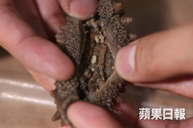 先將刺參放進清水浸一日,浸了一日水後,其實體積已經大了差不多一倍;然後就可以開始第一次加熱,水滾後落海參,轉慢火烚大約10分鐘,蓋上蓋子,焗至水涼,然後就可以開始剪肚;一般人剪肚後就立即除腸,腸仍然緊貼海參,要很花工夫才可以除腸,但Albert就教大家剪肚後,將海參多烚5分鐘,焗到水涼時再除腸,除腸就很輕鬆了。除腸後再做第二次加熱,「其實最重要是核心的內圍,因為海參一定要除腸,刮乾淨之後再煲,參身內沒有腸及內臟阻隔,才可以很快吸水變大,這才為之完成浸發。」Albert說。完成浸發的海參,就可以浸在清水內,放進雪櫃備用。
