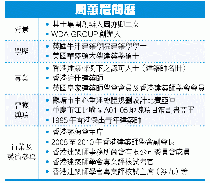 本港地產商最叻是拆樓起樓,利益最大化才是正事,談舊樓加建、改建,似乎風馬牛不相及。「其士第二代」對於周蕙禮而言,只是一個介紹自己的引子,她受訪當日首飾都無戴多件,坦言自己私下只是個「出入地盤、掹咗頂帽、頭髮又亂」、執業至今逾30年的建築師。