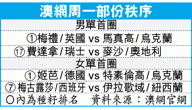 女單方面,姬芭在首圈對烏克蘭的特素倫高,這位28歲的德國球手坦言以一姐身份踏上衞冕之路的壓力大增:「每個比賽對我而言都是個新挑戰,即使我成為世界第一,仍不會改變這種態度。」今屆澳網的總獎金共有5,000萬澳幣(約2.9億港元),比上屆多出14%。