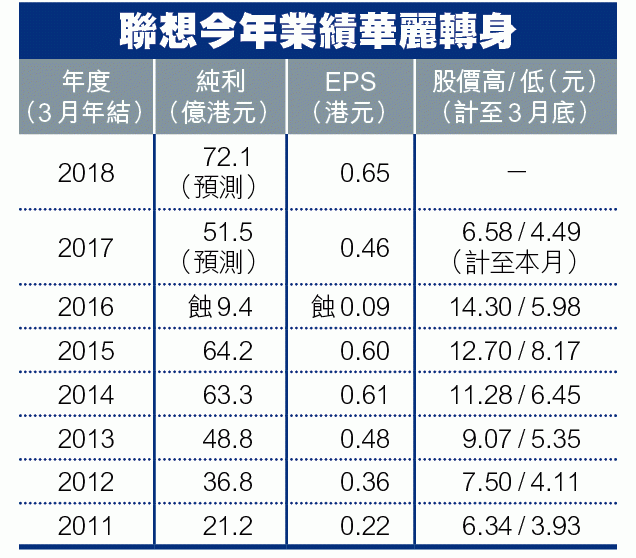 4)在虧損的2016年度,聯想每股仍派息26.5仙(中期6仙,末期20.5仙),2017年恢復盈利,已派中期6仙,即使末期不變,股息率仍達5.2厘。2018年,預期加派股息15%,股息率高達6厘,是另一項吸引力。