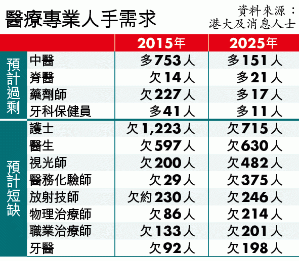 食物及衞生局成立的醫護人力規劃和專業發展策略督導委員會,委託香港大學研究醫護人手。港大去年5月向委員會匯報結果顯示,2015年本港多出753名中醫,2025年約有151名中醫過剩。港大正展開新一輪研究,或會調整數據。中醫業管理委員會資料顯示,截至去年7月本港有9,747名註冊、有限制註冊及表列中醫。