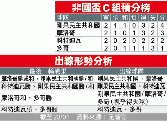 摩洛哥暫以三分排第二,而科特迪瓦就以兩分排第三,兩隊皆以三分為目標,望鎖定八強席位。摩洛哥防線有祖雲達斯中堅貝拿迪亞坐鎮,前場就有摩納哥翼鋒拿比達亞,大部份國腳都在歐洲主流聯賽落班,實力不俗。雖然摩洛哥今屆首仗不敵剛果民主共和國,但他們上場即回勇,以3:1反勝多哥,相信可提升士氣。