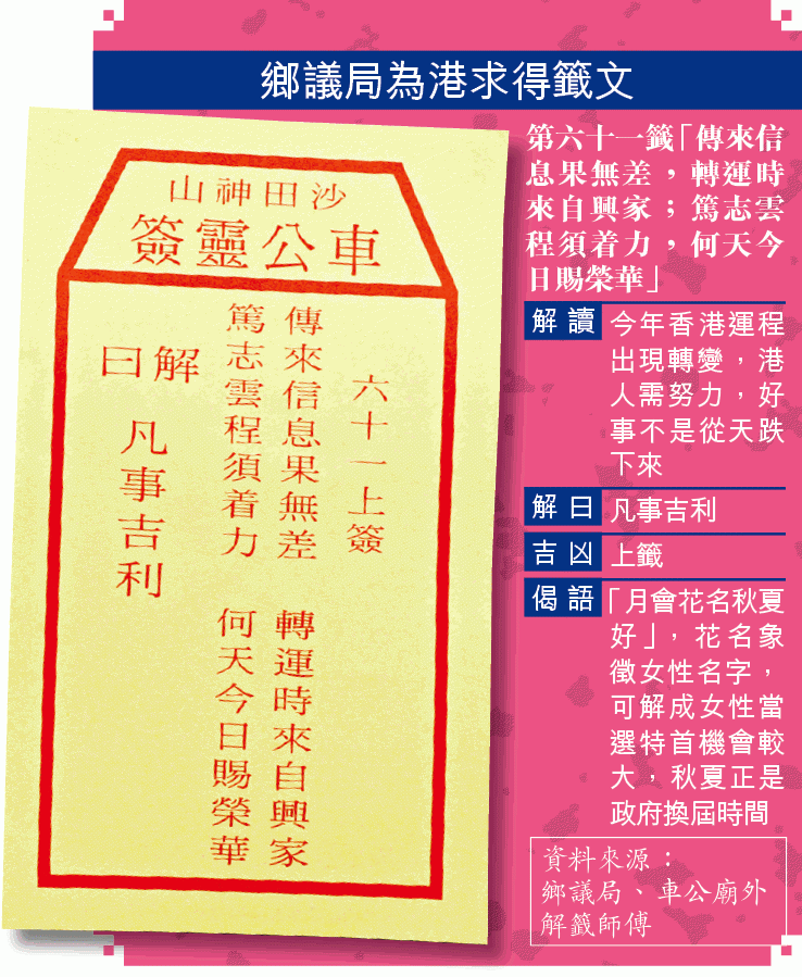 【本報訊】特首選戰消息滿天飛,鄉議局主席劉業強昨在大年初二到沙田車公廟為香港求籤,車公以上籤六十一籤「傳信」。籤文首兩句「傳來信息果無差,轉運時來自興家」,劉業強認為代表任何一位當選特首香港都有新景象。有解籤師傅指,籤文偈語暗示林鄭月娥當選機會較大。有市民則解讀籤文尾句「何天今日賜榮華」有「華」字,覺得曾俊華會當選。