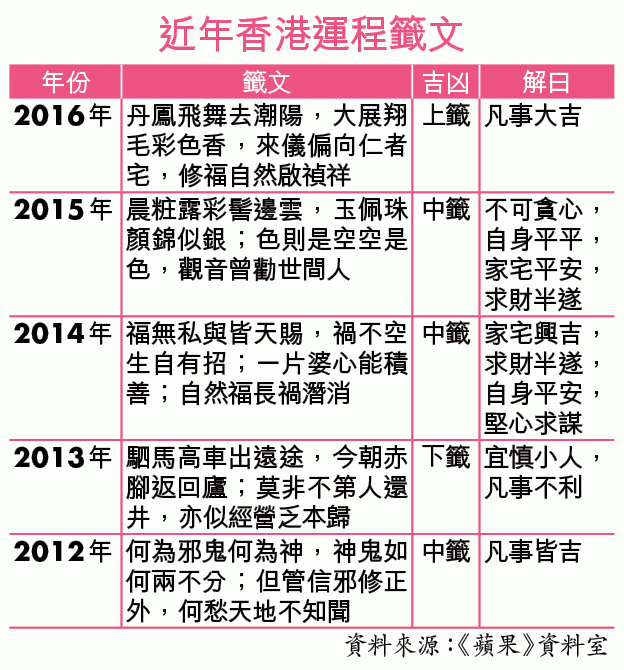 鄉議局主席劉業強昨在車公誕按傳統為香港求籤,連續兩年求得上籤,今年籤文是「傳來信息果無差,轉運時來自興家;篤志雲程須着力,何天今日賜榮華」。解曰凡事吉利,鄉議局安排解籤師傅解釋,籤文指香港今年有好訊息、好轉變,只要市民及政府努力,香港會繼續繁榮穩定。劉業強早前加入林鄭月娥競選辦,昨被追問是否支持林鄭,僅稱言之過早,任何一位當選都有新景象。
