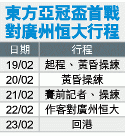 東方上周六在菁英盃狂數富力晉級後,球隊有超過一星期的時間準備對恒大,而球隊周二復操,昨晨開始為賽事展開最後備戰;經過熱身後,教練陳婉婷向球員講解戰術及踢法,之後正式落場試陣;「牛丸」早前表示,球隊在亞冠盃面對強手是無可避免的變陣及改變踢法,而昨日初次排出5-4-1試陣,前線以射手洛迪古斯作單箭頭,中場為麥基、白鶴、迪高、李康廉;五個後防為曾錦濤、羅拔圖、米曹、曾至孝及黃梓浩。