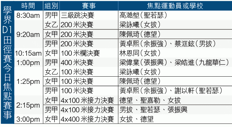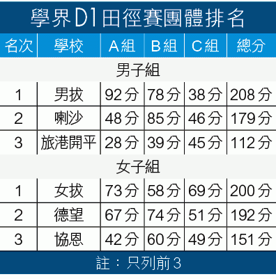 港九學界D1田徑賽今日假灣仔運動場舉行決賽,學界田徑霸主拔萃男、女書院今屆受列強進逼,女拔更與德望學校鬥得難分難解,連霸夢難關重重;團體冠軍未知鹿死誰手,今日田徑場上必會有一番龍爭虎鬥。