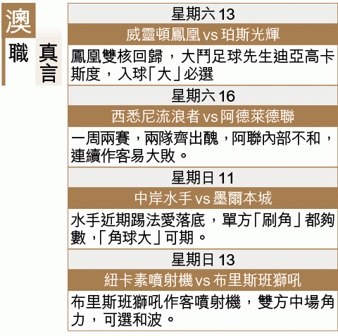 香港球隊打入亞冠,大賽氣氛來襲,球場內外都要大搞綽頭之際,相信近年發展積極的澳職聯賽,絕對可以借鏡,我更希望可以現場為決賽評述。