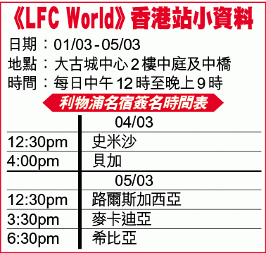 希比亞與加西亞、貝加、史米沙和麥卡迪亞仍會繼續留港,五人會在不同時間在太古城中心舉行簽名會(見附表),同場亦有虛擬實景器(VR),讓球迷體驗晏菲路現場感覺。