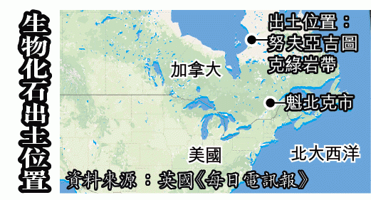 報告前日在《自然》期刊發表,由英國大學學院領導的研究團隊在現存世上最古老岩層之一、魁北克省的努夫亞吉圖克綠岩帶發現微生物化石,估計距今37.7億至42.9億年。化石藏於花狀石英中,從顯微鏡影像顯示,化石呈血紅色管狀,寬約40微米、即人類頭髮寬度一半,長則半毫米,相信是生長於60℃深海熱泉中的細菌。牠們以圓形底部黏附岩石上,管狀莖部則用以吸收主要營養來源──鐵質。