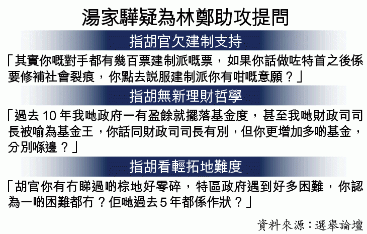 湯家驊甚至批評胡是偏激政客,疑似藉此助攻,「你話林鄭月娥比梁振英更加梁振英,又話會盡百分之二百阻止佢當選,我想問你,究竟係參選特首,定係阻人參選?你以偏激政客嘅言詞攻擊對手,假如你當選嘅態度或者言詞,如何修補泛民與建制裂痕有乜嘢幫助?」