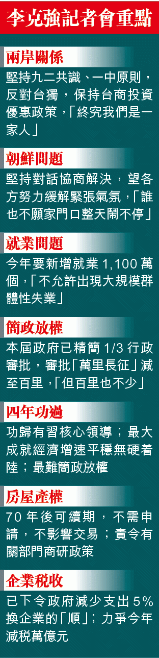 全國兩會昨落幕,總理李克強在人大閉幕後記者會表示,中國不會因美國退出泛太平洋夥伴關係協議(簡稱TPP),填補美國角色去擔大旗。中國支持貿易自由化,「天下是天下人的天下」;但中國「不會越俎代庖,超越區域去做不應是中國做的事」。李還警告若中美打貿易戰,首當其衝是在華的美資企業。