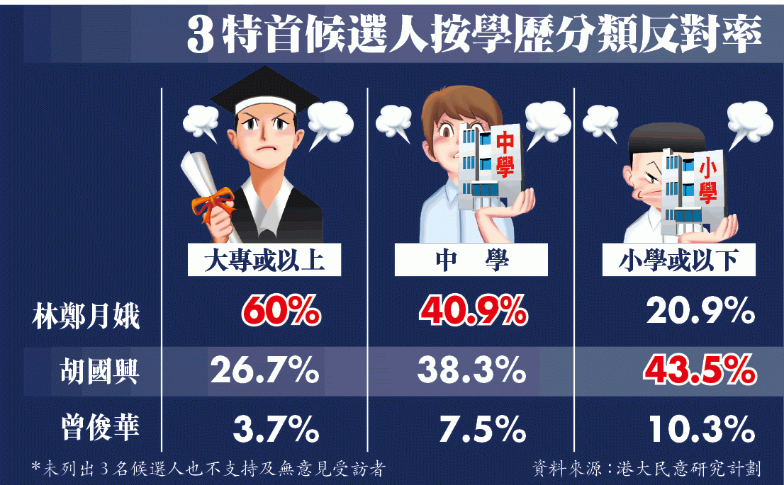 而反對林鄭月娥做特首的人遍佈不同學歷、職業及政治光譜。按教育程度劃分的話,林鄭月娥顯然不獲高學歷人士支持,大專或以上學歷的人當中,竟然有多達六成人反對她當選,即使是中學學歷人士亦有約41%,到小學或以下學歷人士才減至約21%。
